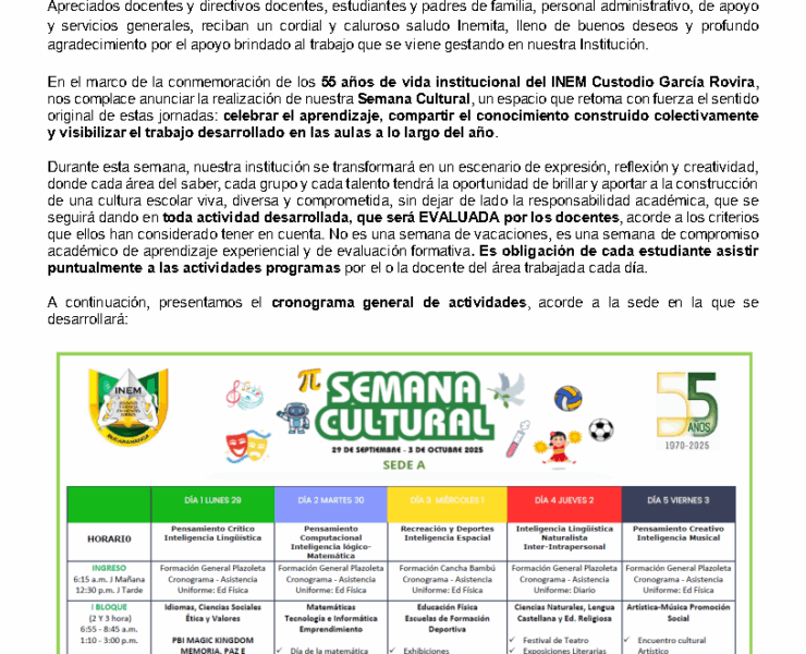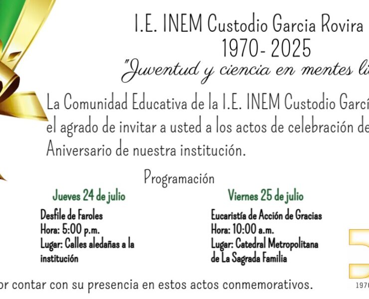 INVITACIÓN ESPECIAL A LOS ACTOS DE CONMEMORACIÓN DE LOS 55 AÑOS DE LA I.E. INEM CUSTODIO GARCÍA ROVIRA