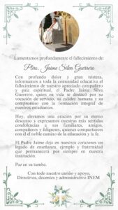 Con profundo pesar, la Institución Educativa INEM Custodio García Rovira lamenta el sensible fallecimiento de nuestro compañero y guía espiritual, el Padre Jaime Silva Guerrero. Agradecemos su invaluable labor, su entrega y su ejemplo, que dejaron huella en nuestra comunidad educativa. Nos unimos en oración y extendemos nuestras más sentidas