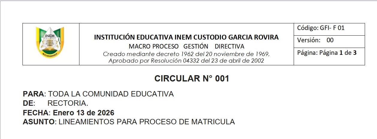 I.E. INEMEn cumplimiento del Decreto 4807 de 2011 y la Política de Gratuidad Educativa establecida por el Ministerio de Educación Nacional, la Institución Educativa INEM informa a la comunidad que la educación en los niveles de Preescolar, Básica y Media es totalmente gratuita.