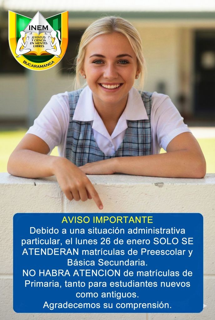 Debido a una situación administrativa particular, el lunes 26 de enero solo se realizará atención para matrículas de Preescolar y Básica Secundaria.