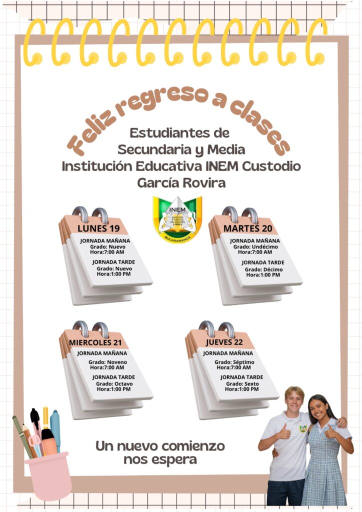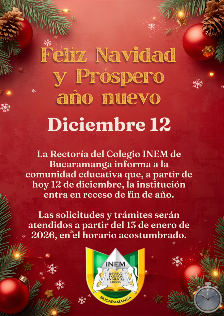 Inem https://inembucaramanga.edu.co/web Instutición educativa Sat, 17 Jan 2026 18:06:12 +0000 es hourly 1 https://inembucaramanga.edu.co/web/wp-content/uploads/2024/07/cropped-148x148-1-32x32.png Inem https://inembucaramanga.edu.co/web 32 32 horarios Preescolar y primaria https://inembucaramanga.edu.co/web/horarios-preescolar-y-primaria/ Sat, 17 Jan 2026 18:06:10 +0000 https://inembucaramanga.edu.co/web/?p=20894 ]]> Horarios regreso a clase https://inembucaramanga.edu.co/web/horarios-regreso-a-clase/ Fri, 16 Jan 2026 21:30:05 +0000 https://inembucaramanga.edu.co/web/?p=20890 ]]> ¡CONVOCATORIA ABIERTA! Arrendamiento de Papelería Escolar – INEM Bucaramanga 2026 https://inembucaramanga.edu.co/web/convocatoria-abierta-arrendamiento-de-papeleria-escolar-inem-bucaramanga-2026/ Thu, 15 Jan 2026 00:22:29 +0000 https://inembucaramanga.edu.co/web/?p=20882 Invitacion de papeleriaDescarga ]]> Circular 001 Proceso de matricula 2026 https://inembucaramanga.edu.co/web/circular-001-proceso-de-matricula-2026/ Wed, 14 Jan 2026 20:20:32 +0000 https://inembucaramanga.edu.co/web/?p=20880 CIRCULAR 001Descarga ]]> Felíz navidad y próspero año nuevo https://inembucaramanga.edu.co/web/feliz-navidad-y-prospero-ano-nuevo/ Sat, 13 Dec 2025 02:43:28 +0000 https://inembucaramanga.edu.co/web/?p=20852 ]]> INFORME DE EVALUACION DE LA MEJOR PROPUESTA – TIENDA ESCOLAR https://inembucaramanga.edu.co/web/informe-de-evaluacion-de-la-mejor-propuesta-tienda-escolar/ https://inembucaramanga.edu.co/web/informe-de-evaluacion-de-la-mejor-propuesta-tienda-escolar/#respond Tue, 02 Dec 2025 00:38:41 +0000 https://inembucaramanga.edu.co/web/?p=20781 EVALUACION PROPUESTAS T.ESCOLARES 2026Descarga ]]> https://inembucaramanga.edu.co/web/informe-de-evaluacion-de-la-mejor-propuesta-tienda-escolar/feed/ 0 Así me veo, Así me siento: Autoestima en séptimo grado. https://inembucaramanga.edu.co/web/asi-me-veo-asi-me-siento-autoestima-en-septimo-grado/ https://inembucaramanga.edu.co/web/asi-me-veo-asi-me-siento-autoestima-en-septimo-grado/#respond Thu, 27 Nov 2025 15:14:03 +0000 https://inembucaramanga.edu.co/web/?p=20771 Se trabajo con los chicos de 7° este 2026 – INEM-UIS https://youtu.be/YEyVT8R1mUc